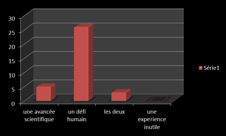 Pourtant, le projet Red Bull Stratos a plus été considéré comme un défi humain. Comme vous pouvez le constater ci-dessous, sur un pannel de 34 personnes (hommes et femmes) ayant répondu à la question : "Pensez-vous que ce projet constitue... une avancée scientifique ? ...un défi humain ? ...les deux ? ...une experience inutile ? " , 26 ont déclaré que la mission était un défi humain.