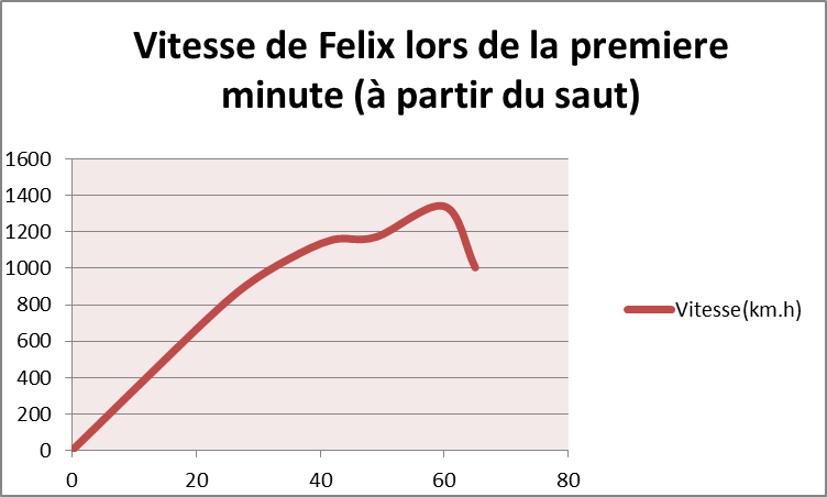 Sur ce graphique, on peut remarquer que la vitesse lors de la première minute n'a cessée d'augmenter jusqu'à 40 secondes (~1158 Km/h), puis s'est stabilisée pendant 10 secondes pour réaugmenter jusqu'a 1342 Km/h (vitesse maximale du saut) à environ 56 secondes, puis elle va commencer à baisser et cela continuera jusqu'à ce que Felix touche la terre ferme.
